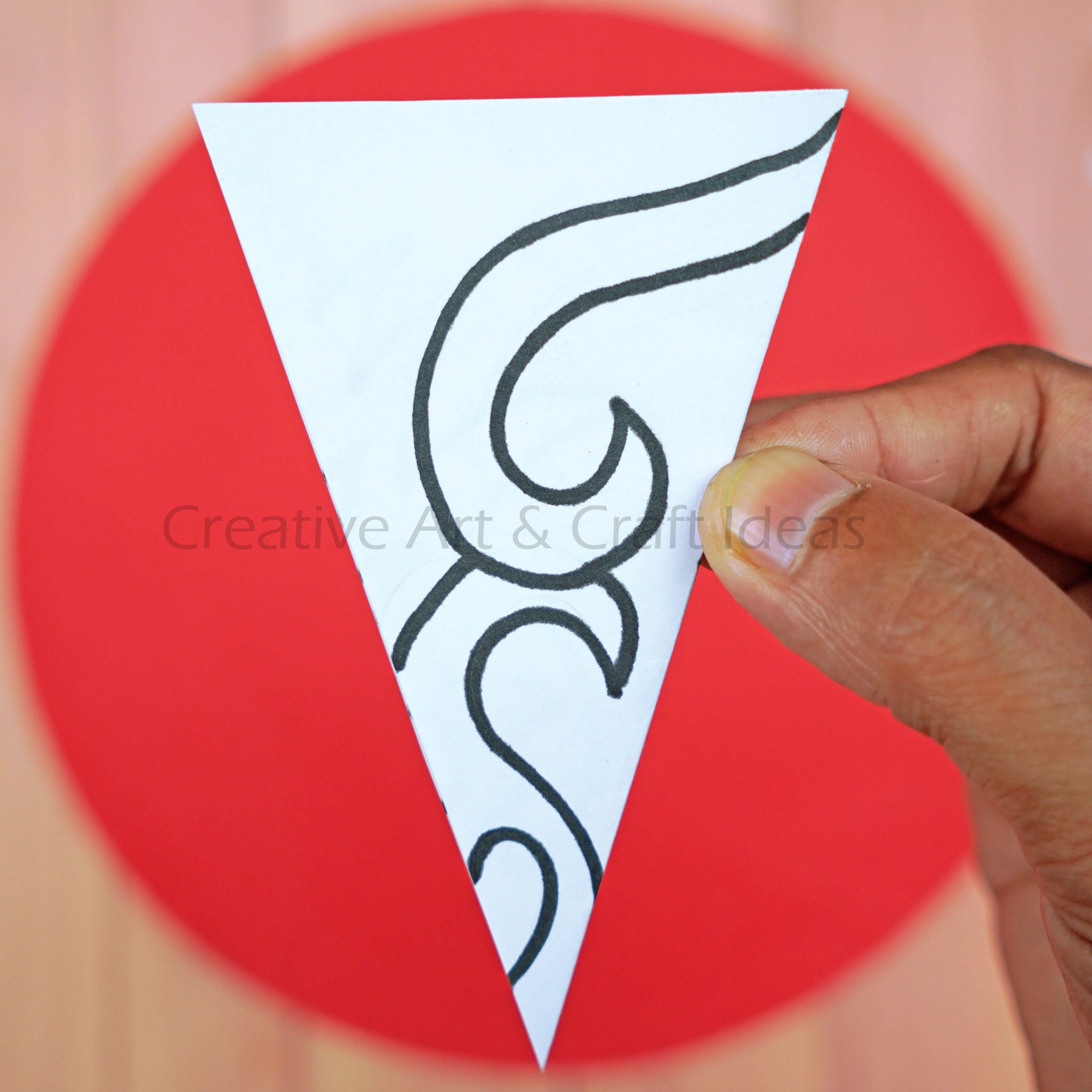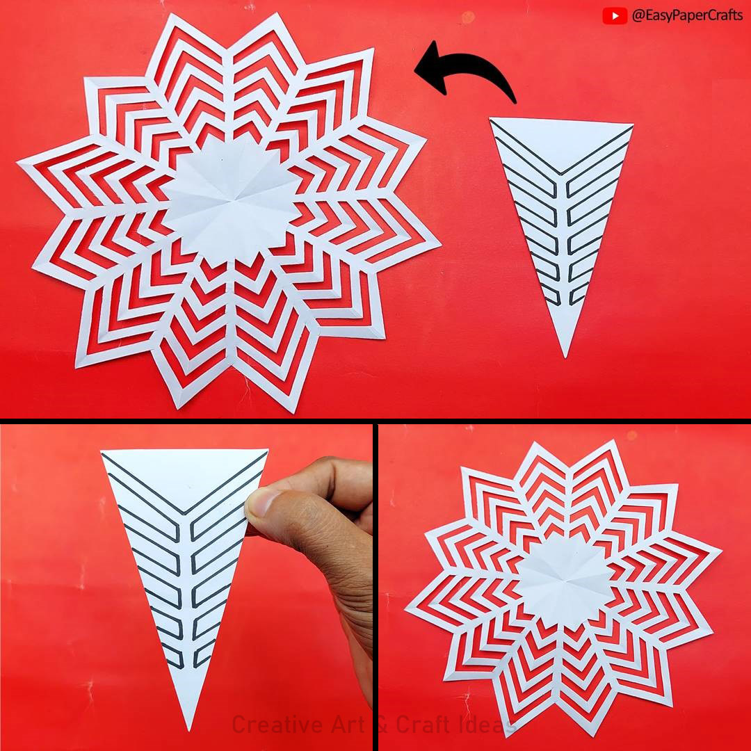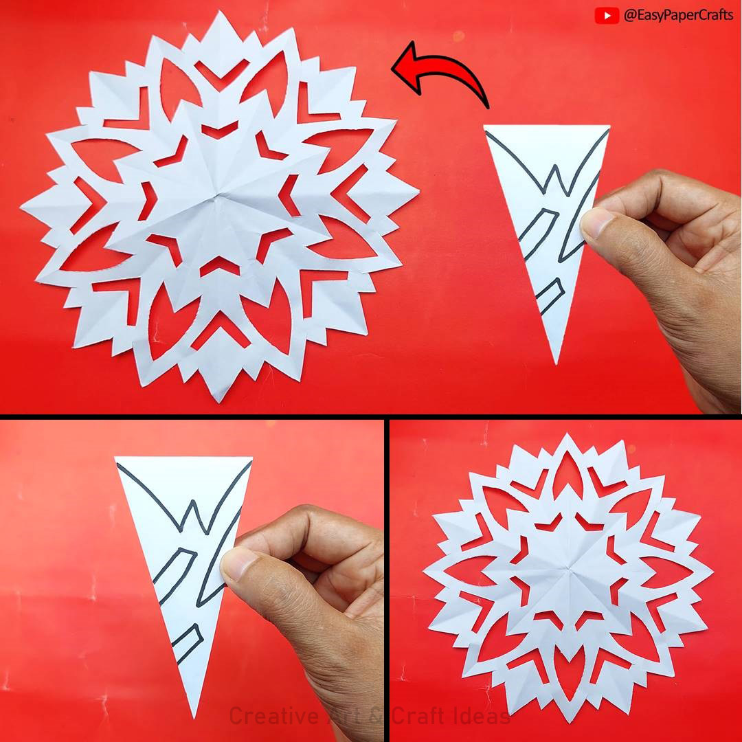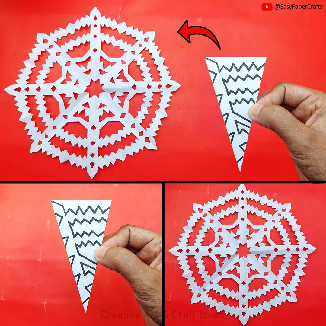 Для цього квадратний аркуш потрібно скласти навпіл тричі, щоб утворився гострий трикутник. Візерунок вирізається так само, але результат матиме 8 променів.