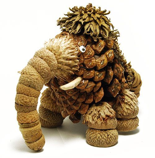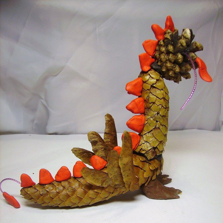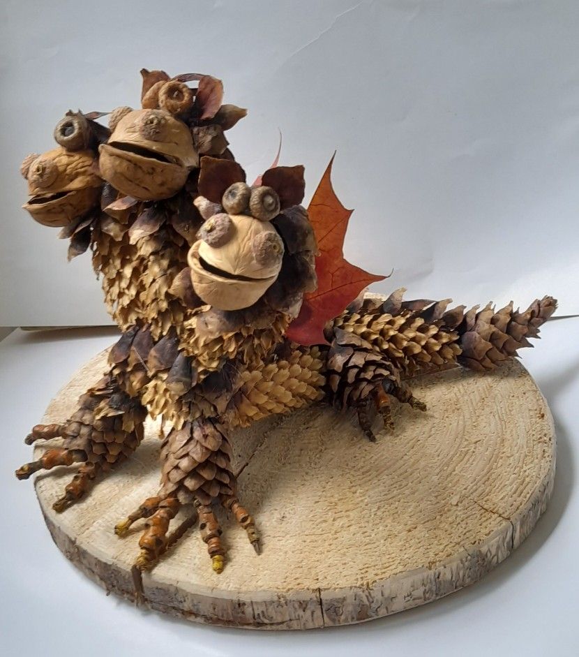 Дракон: З’єднайте кілька шишок дротом, щоб створити довге тіло. Крила — з великого листя.