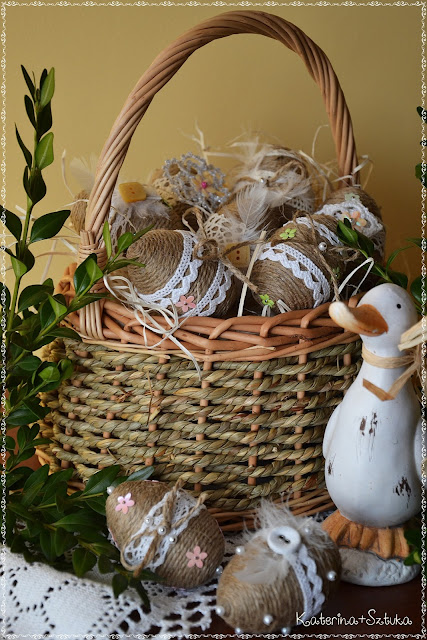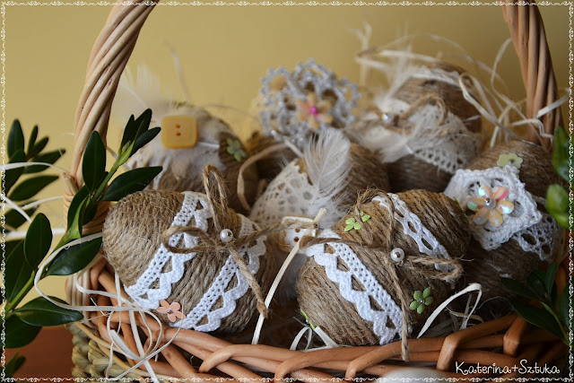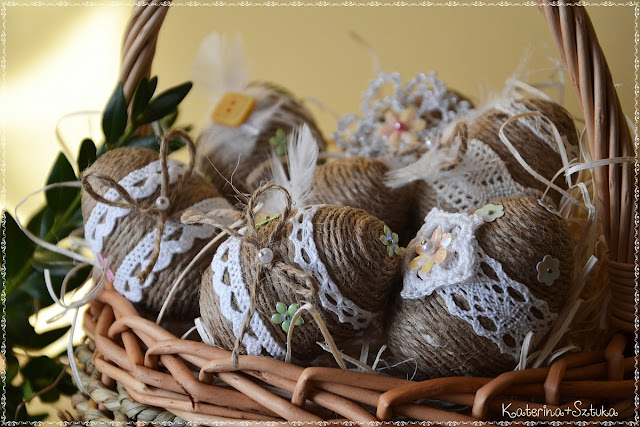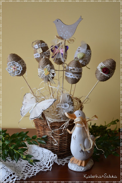Witam :) ja ciągle w pogoni i w pogoni, sezon grypowy zaczęty i jak nie w pracy jestem na zastępstwie to w domu nie wiem później za co mam się brać. Ostatnimi dniami zrobiłam pisanki ze sznurka jutowego, kilku koronek (resztek) jakiś uzbieranych szpargałów i całość kleiłam Magic-em i wbijałam na kijek do szaszłyków. Jajka styropianowe 6cm.