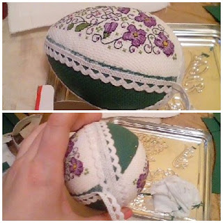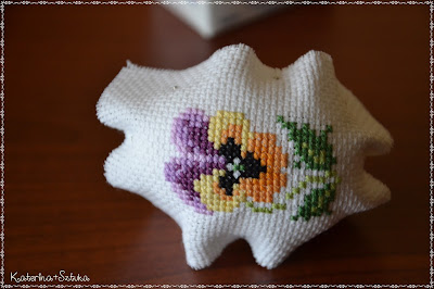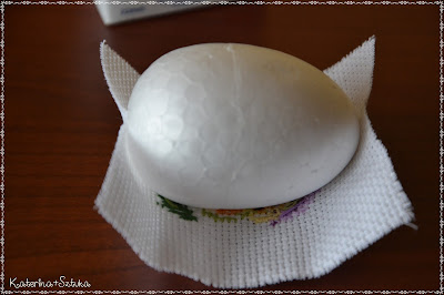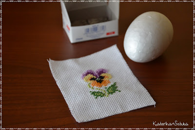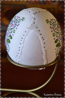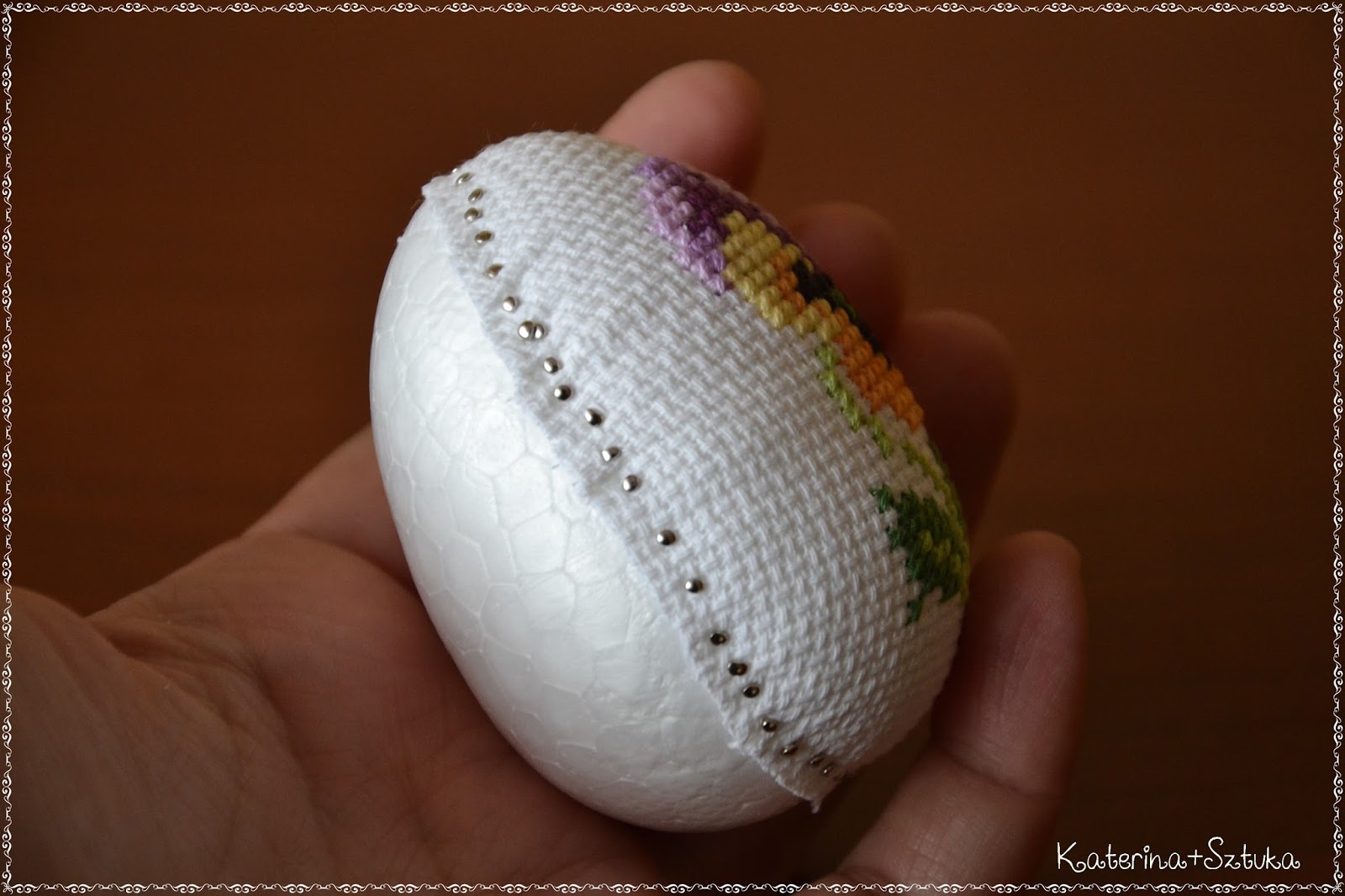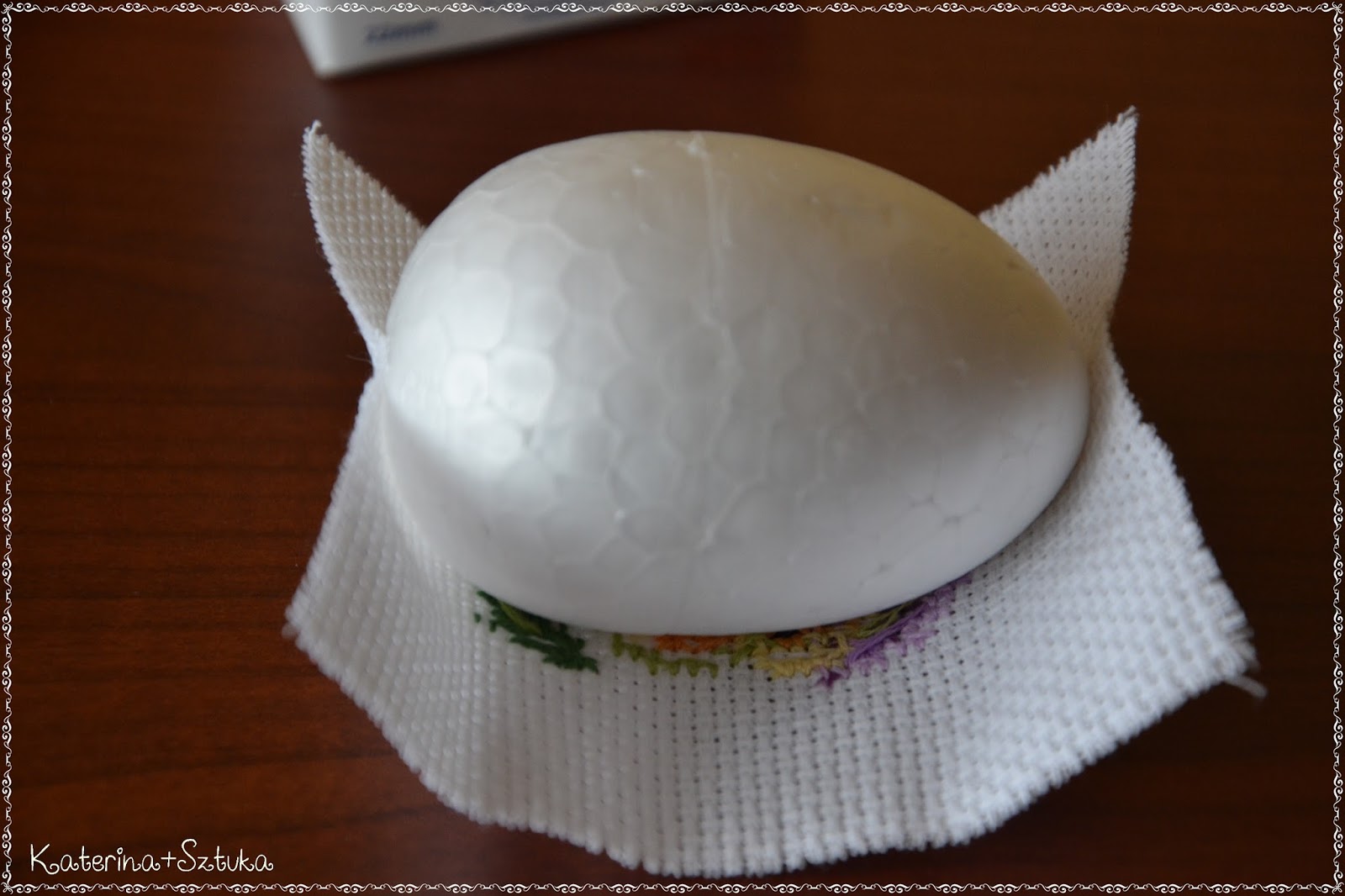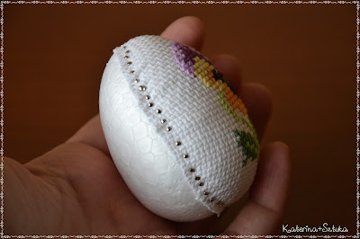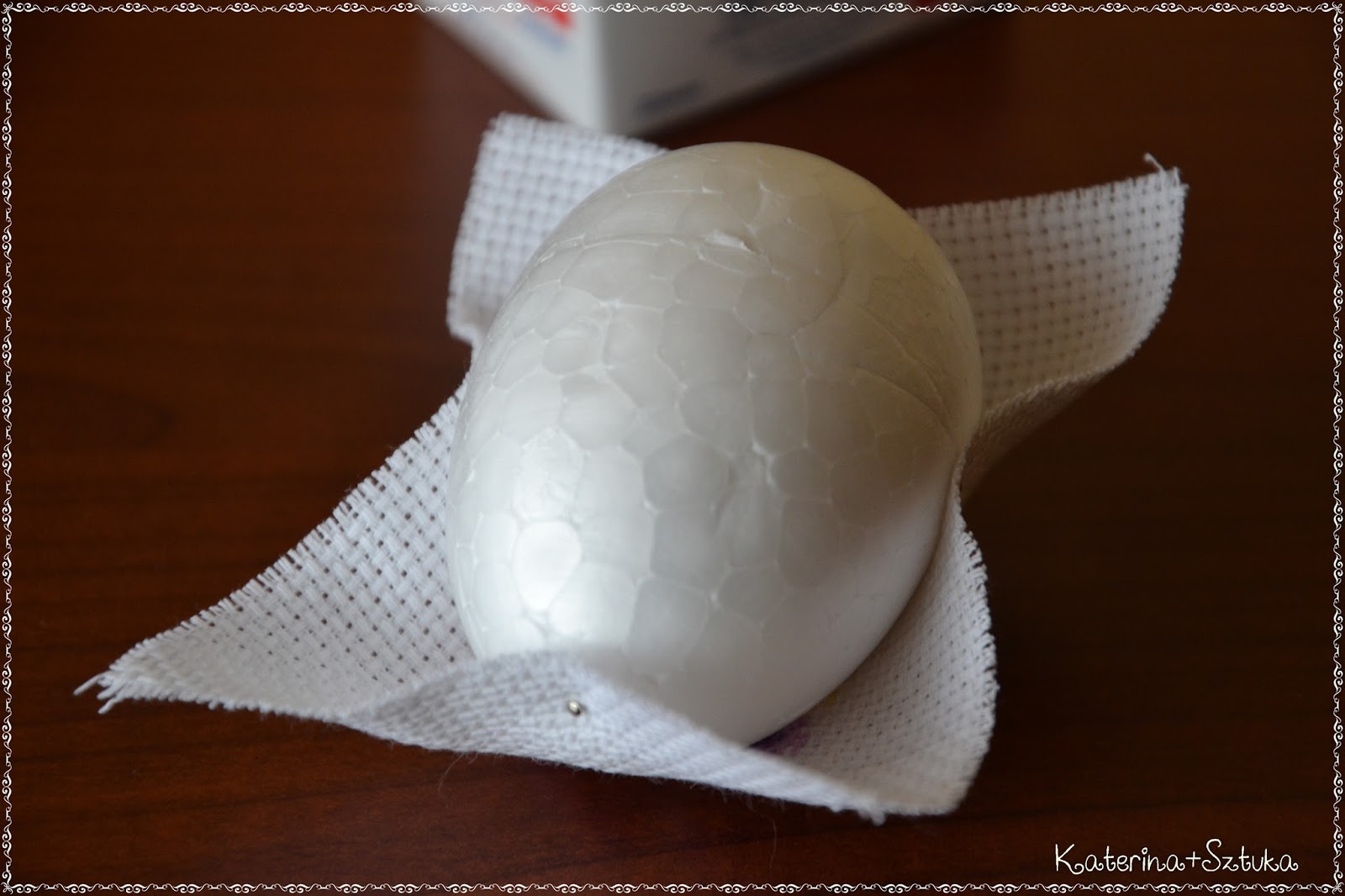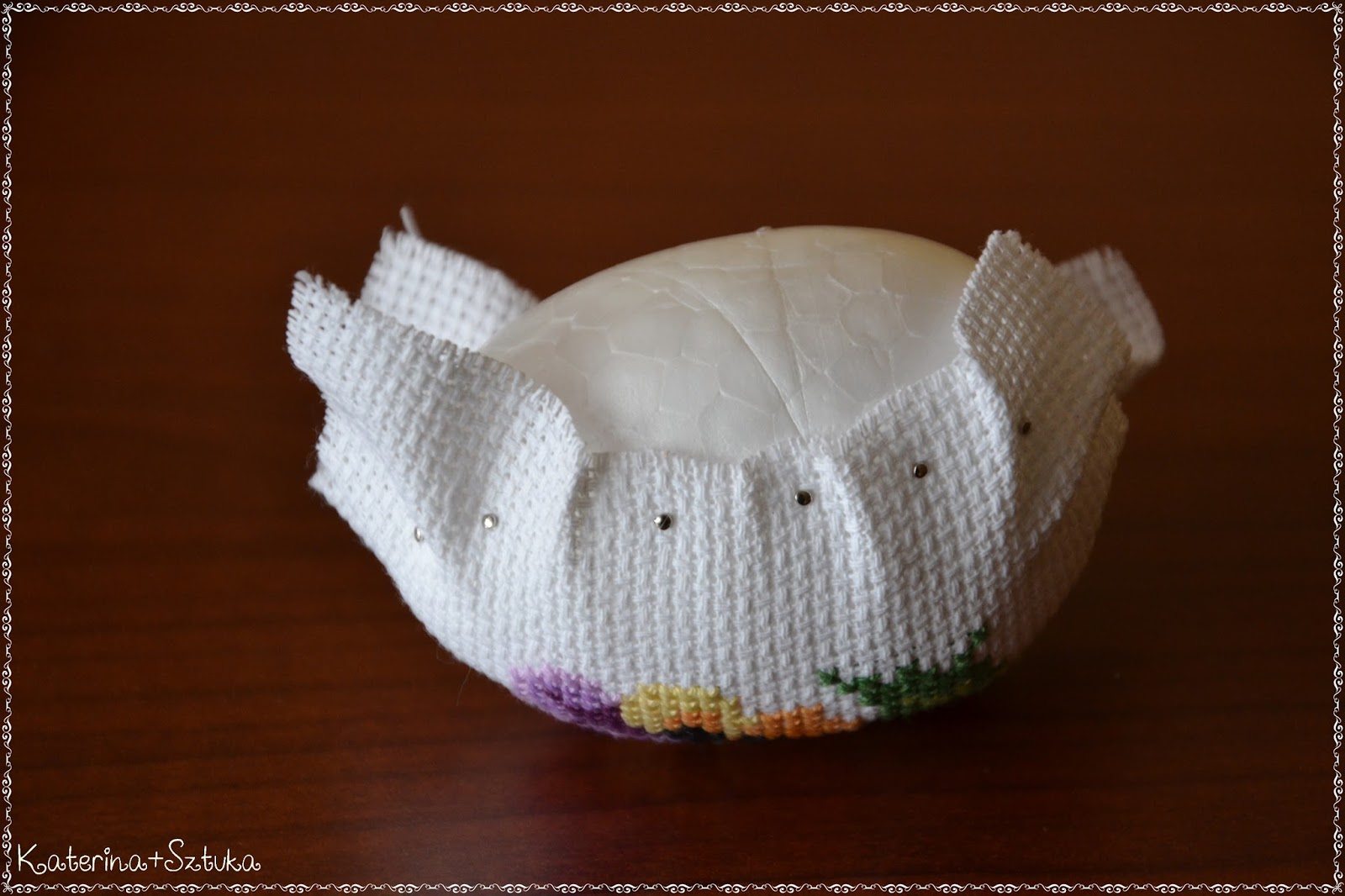 1/ Kanwę z gotowym haftem piorę ręcznie w letniej wodzie z szarym mydłem, lekko suszę żelazkiem i lekko wilgotną przytwierdzam szpikami bez kleju do styropianowych jajek. Wilgotna kanwa daje się dobrze prowadzić i naciągać a po wyschnięciu pięknie się układa i usztywnia. Tu wzór jajko 7cm.