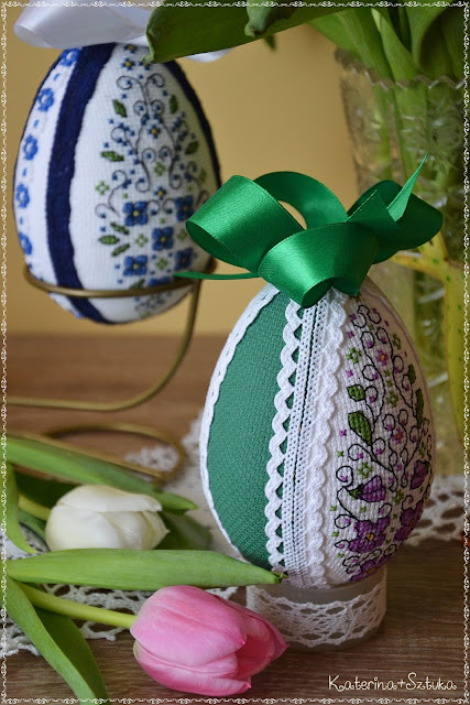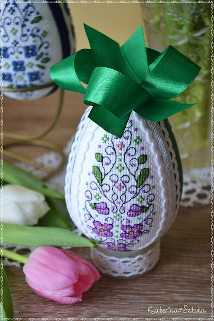 Witam w walentynki :) ale zamiast serc mam dziś jajka :D Styropianowe jajka 12 cm oklejone haftami i tasiemkami. Kanwa 14stka, biała i zielona usztywniana, nici Ariadna i wzór motywu z ulubionej gazetki ''Igłą malowane''